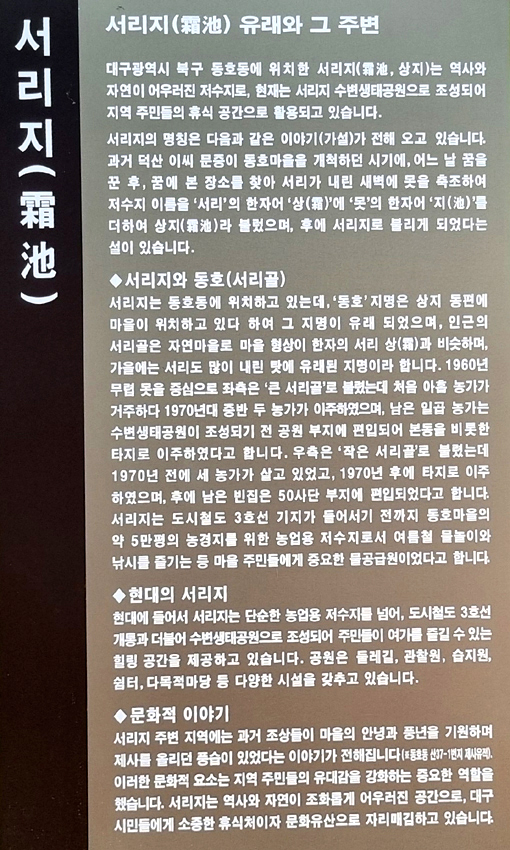 오늘은 대구광역시 북구 동호동에 있는 서리지를 간다. 이름도 들어보지 않은 생태공원 둘레길이다. 서리지는