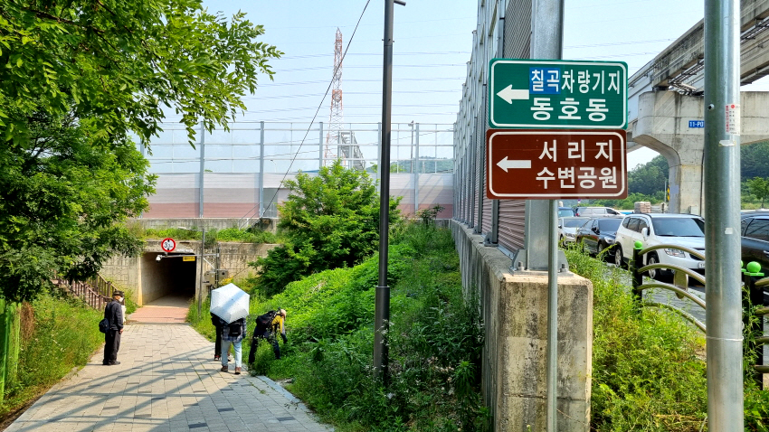 <사진 3> 서리지 가는 길안내 - 지하철3호선 종점인 칠곡경대병원역에 내린다. 셔틀버스 정류장 맞은편에서 차량기지 쪽으로 50m 정도 가면 서리지수변공원 가는 안내판이 보인다.