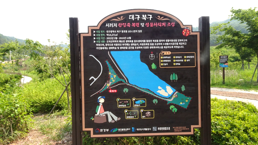 인공저수지로 이를 생활공간에 이용하기 위하여 2022년 3월 부터 2022년 12월 까지 ‘서리지 산림축 복원 및 생물서식처 조성사업’을 실시하였다. 정확한 위치는 대구광역시 북구 동호동 103-1번지 일원이다. 이 사업을 시작한 까닭은 도덕산 자락의 훼손된 생태축을 생태계 복원을 통하여 생물 이동성을 강화하고 서리지 주변의 경작용 부지는 생태습지, 야생화화원 등을 조성하여 작은 생물들의 서식공간을 만들어 생태학습 및 생태관찰 공간을 조성해 다양한 생태서비스를 제공함에 목적을 두고 실시한 결과물이 '서리지 수변생태공원'이다.